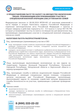 О ПРЕДОСТАВЛЕНИИ ЛЬГОТ ПО НАЛОГУ НА ИМУЩЕСТВО ФИЗИЧЕСКИМ ЛИЦАМ, ПРИНИМАЮЩИМ ИЛИ ПРИНИМАВШИМ УЧАСТИЕ В СПЕЦИАЛЬНОЙ ВОЕННОЙ ОПЕРАЦИИ (СВО) И ЧЛЕНАМ ИХ СЕМЕЙ